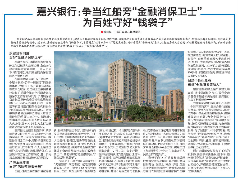 在金融产品和金融服务日趋繁荣和多样化的今天,增进人民群众对现代金融知识的了解、切实保护金融消费者合法权益早已成为嘉兴银行落实服务客户、防范和化解金融风险、履行社会责任的重要任务与使命。近年来,嘉兴银行在监管部门的指导下,牢固树立“以客户为中心”的发展理念,用行动落实“金融为民”要求,以打造嘉兴人自己的、可信赖的银行为前进方向,不断助推金融消费权益保护工作入深入细,为保护消费者的“钱袋子”交上了一份亮眼“成绩单”。