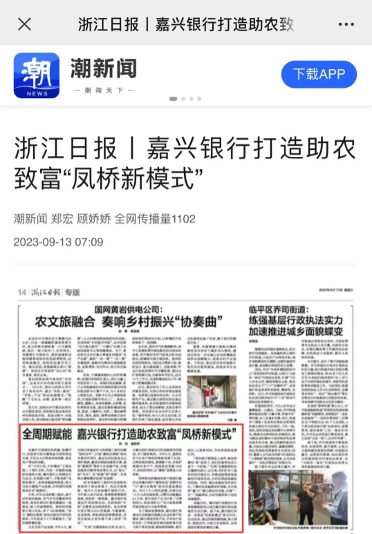 近日,嘉兴银行打造助农致富“凤桥新模式” 受到浙江日报和潮新闻关注。