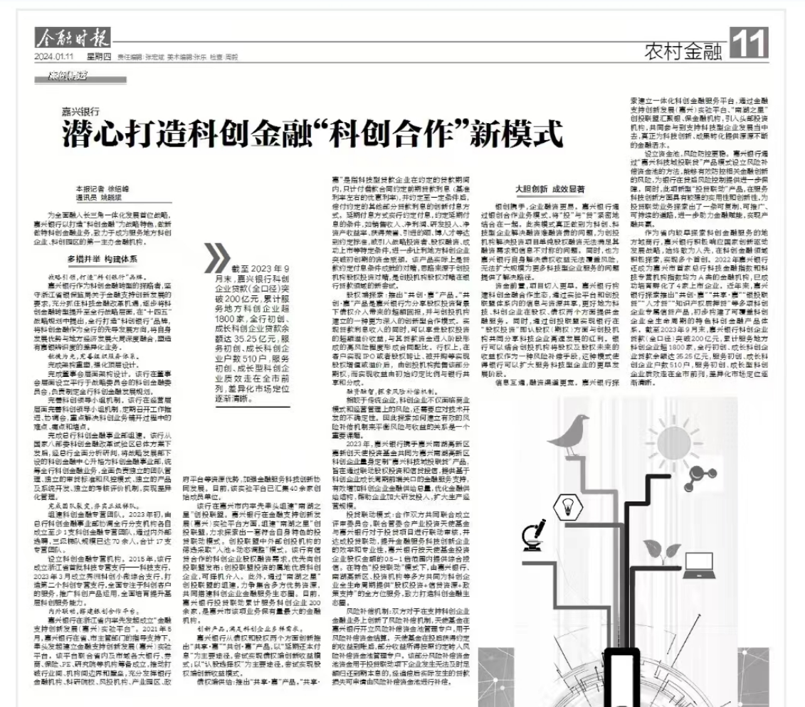 近日,由中国人民银行主管的《金融时报》刊登了嘉兴银行潜心打造科创金融“科创合作”新模式的案例,点赞了嘉兴银行在全力推进科创金融特色银行全面转型的优秀做法,全文如下: