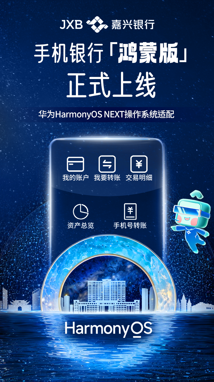鸿蒙操作系统(HarmonyOS NEXT)是华为公司自主研发的一款设备互联、数据共享的操作系统,可为用户提供更加流畅、安全的使用体验,其强大的分布式能力、流畅的操作体验以及高度的安全性,为金融行业带来了前所未有的发展机遇。嘉兴银行紧跟时代步伐,积极响应市场需求,制定适配方案,经过三个多月的精心研发与严格测试,于9月24日成功推出了适配鸿蒙系统的手机银行新版本,标志着我行在金融科技领域的又一重要里程碑!这不仅是嘉兴银行支持国家战略,对鸿蒙生态的有力支持,也是践行“事事以客为尊”服务理念的具体体现。