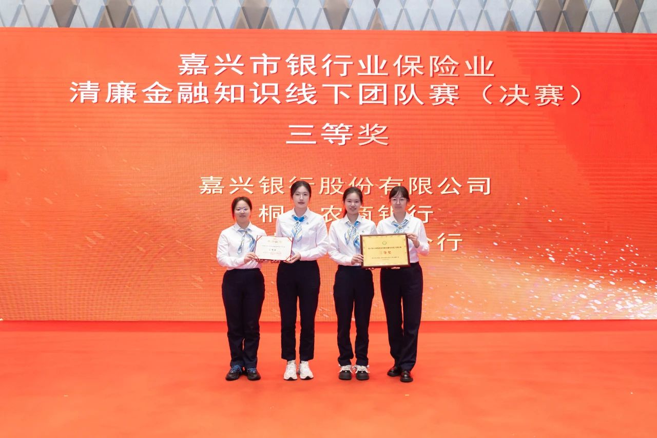 10月15日,嘉兴市银行业保险业清廉金融知识线下团队赛(决赛)落下帷幕,嘉兴银行代表队在43支参赛队伍中脱颖而出,获得三等奖(第四名)荣誉称号。本次比赛由国家金融监督管理总局嘉兴监管分局指导,嘉兴市银行业协会、嘉兴市保险业协会、嘉兴金融团工委主办。