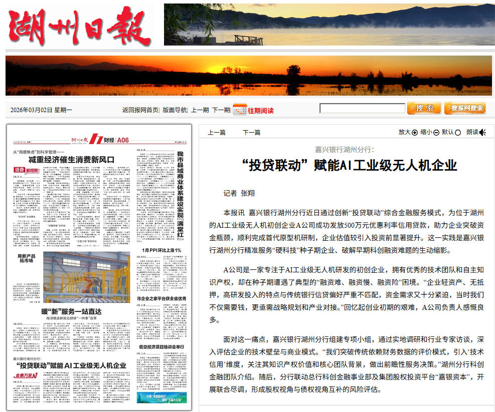 近日,湖州日报财经版专题报道《嘉兴银行湖州分行“投贷联动”精准赋能AI工业级无人机企业》的金融助企服务举措,展现嘉兴银行科创金融创新模式,为科创企业提供全生命周期的综合金融支持。原文如下: