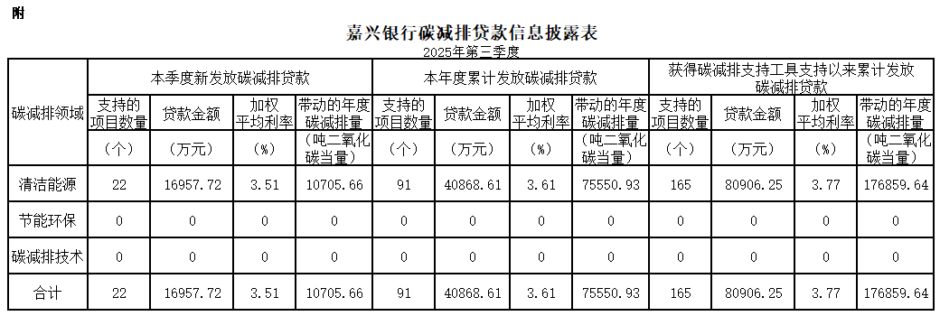 2025年第三季度,嘉兴银行在碳减排支持工具支持下,合计向22个项目发放碳减排贷款16957.718万元,贷款加权平均利率3.51%,带动的年度碳减排量为10705.6608 吨二氧化碳当量,其中碳减排效应最为显著的项目有湖州益广新能源科技有限公司(博华屋顶215KW)分布式光伏项目、德清县舞阳街道纪念堂310kw二期分布式光伏发电项目、浙江永裕家居股份有限公司厂房屋顶2000千瓦分布式光伏发电项目。本年度,嘉兴银行累计向91个项目发放碳减排贷款40868.6113 万元,贷款加权平均利率3.61%,带动的年度碳减排量为75550.9283 吨二氧化碳当量。获得碳减排支持工具支持以来,嘉兴银行累计向165个项目发放碳减排贷款80906.2484万元,贷款加权平均利率3.77 %,带动的年度碳减排量为176859.64 吨二氧化碳当量。