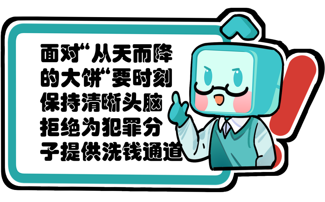 小嘉在这里提醒大家,面对“从天而降的大饼”要时刻保持清晰的头脑,拒绝为犯罪分子提供洗钱通道。