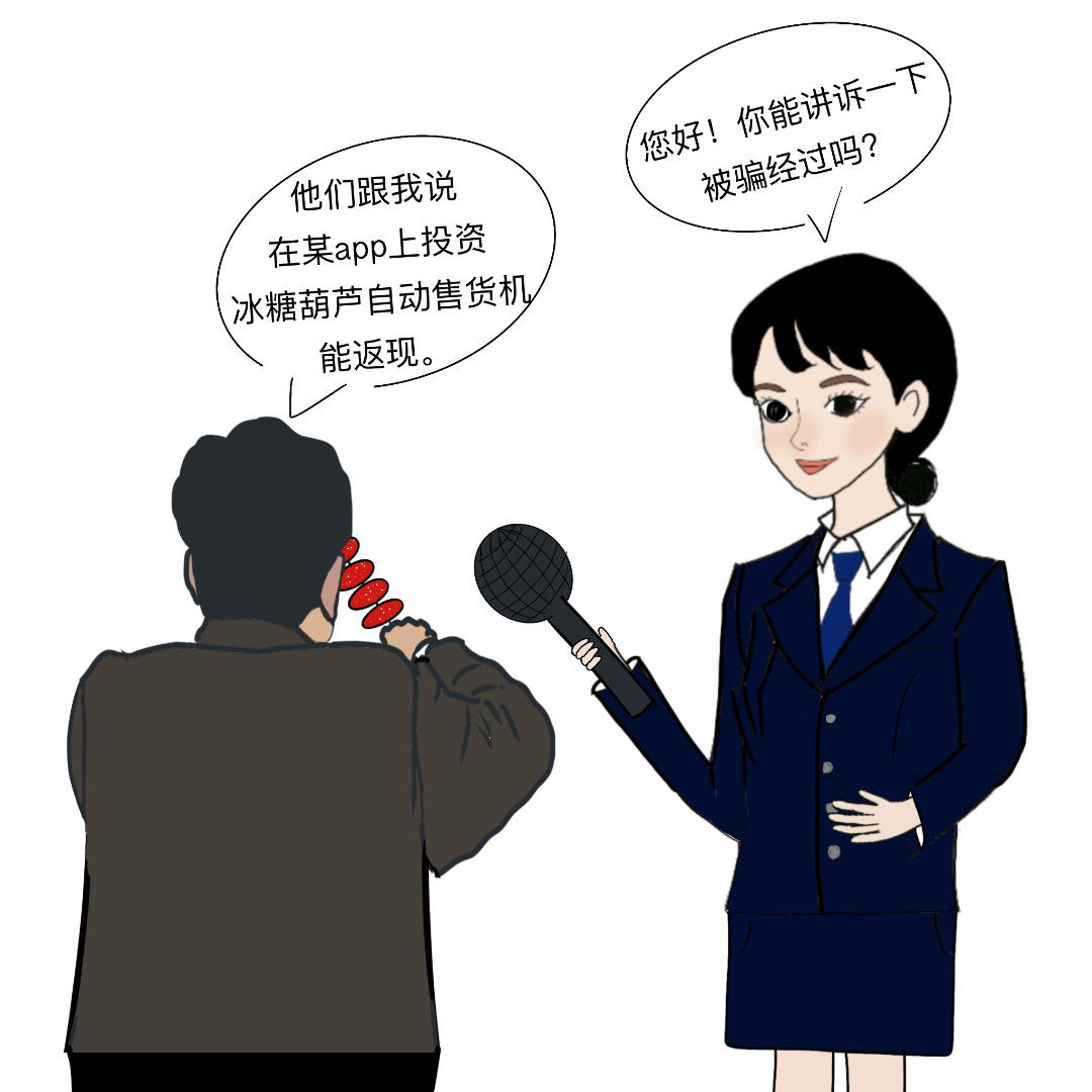 去年8月A先生联系到媒体,称自己经熟人介绍在某APP上投资了5台冰糖葫芦自动售货机,总共花费近5万,并全权托管一家公司“代运营”。介绍人称一支糖葫芦卖9.9元,一台机器投资9999元,周期270天,每天可返利55元,10000元可以返14850元左右,并且随时可以提现。但是合同期限还没到,平台上的返现收益就变为空白,上家也联系不上了。其实A先生遭遇到了以投资冰糖葫芦售货机为幌子的非法集资骗局。
