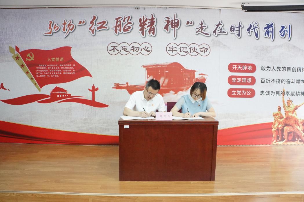 签约仪式上,嘉兴银行副行长兼秀洲支行党支部书记章张海和秀禾集团第一党支部书记杨晶晶分别代表双方党支部签订了共建协议。