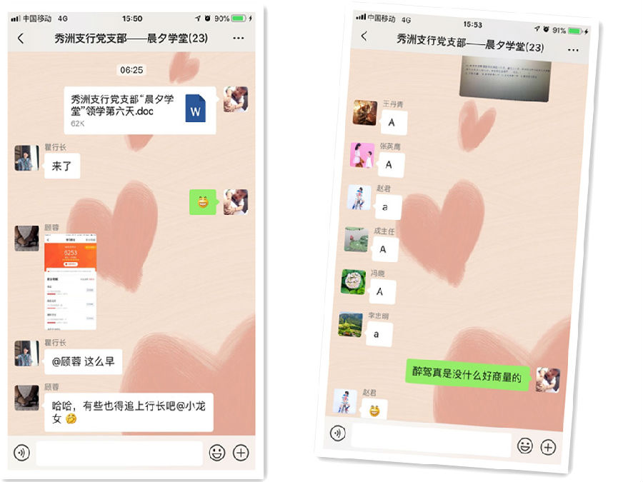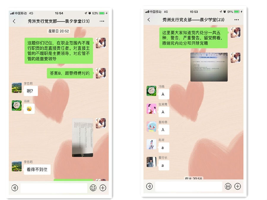 “晨夕学堂”面向支行全体党员,以微信学习群为载体,于每日6:30左右开始,采取党员同志轮流领学的方式,学习内容涵盖《党章》、《中国共产党党员纪律处分条例》、《中国共产党廉洁自律准则》、《关于新形势下党内政治生活的若干准则》等16份基础党建纪检知识文件。同时,为了进一步提升学习成效,支行党支部还于每晚采取分组视频抽查、问题抢答等巩固手段,回顾每日所学。试行一周以来,全行党员反响良好,大家纷纷表示,看一遍,记一遍,问一遍,深入一遍,对基础政治理论有了更深一步的掌握与理解、日常工作应备的政治素养也有了更进一步的提高。