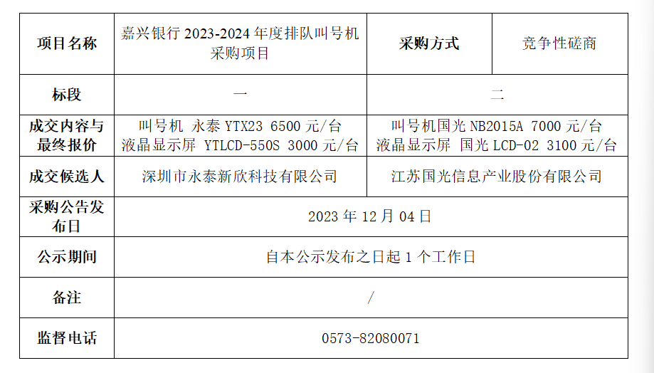 嘉兴银行2023-2024年度排队叫号机采购项目成交公示